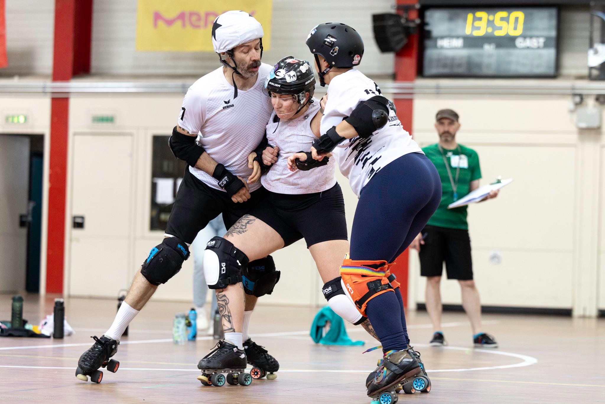 “Ich konnte in Darmstadt erst am Sonntag zum Scrimmage-Teil dazustoßen. Was mir aber sofort aufgefallen ist, war die positive Stimmung, die alle Beteiligten ausgestrahlt haben. Die Officials wurden von vielen Skater*innen direkt begrüßt, und es wurde sich für die Unterstützung bedankt. Diese Wertschätzung hat sich auch beim Spielen selbst gezeigt. Auch in Potsdam hat sich dieses Grundgefühl erhalten, so dass ich eigentlich nur meinen Satz der Abschlussrunde wiederholen kann: Ich freu mich auf mehr!” – Beast vom Officials-Team