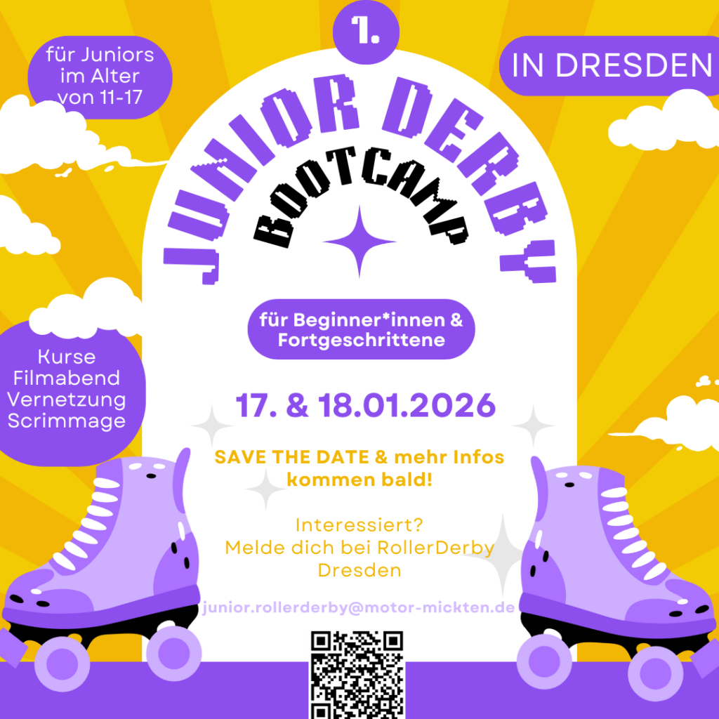Am 17. und 18. Januar 2026 lädt Roller Derby Dresden junge Derbyspieler*innen zum ersten bundesweiten Junior Derby-Bootcamp ein. Die Sportkommission Roller Derby hat einer Fördung zugestimmt, sodass die Teilnahme an dem Wochenend-Event für alle Skater*innen kostenfrei ist.
